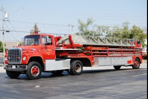 This is a Ford 800. This is one of the oldest ladder trucks still in service in New York State. It has to be steered from both the front and the back. It’s unique design of steering means it can fit in tighter places that the new ladder trucks cannot. It has the carrying capacity of 3 crew members, the truck driver, one passenger, and the person in the back. It holds 6 ground ladders and plenty of ventilation and rescue tools/ equipment.